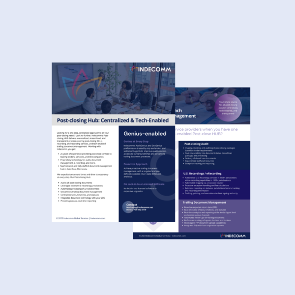 Drive down costs related to cumbersome post-closing document management. Indecomm’s end-to-end post-closing HUB streamlines every aspect of the post-closing process including document package intake, imaging, auditing, and tracking. Leveraging Indecomm’s AuditGenius and DocGenius solution, our team of post-close specialists improve post-close document turnaround times while drastically reducing operational costs.