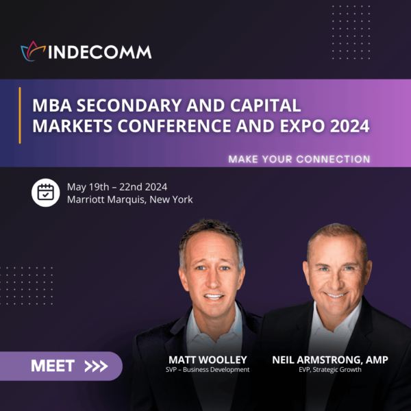 Location: Marriott Marquis, New YorkMeet with Indecomm at the MBA Secondary & Capital Market Conference happening this May and discover how our AuditGenius platform can improve productivity, efficiency, and accuracy of quality control from pre-fund through post-close and secondary marketing due diligence. Don’t wait to schedule a meeting with Indecomm leadership, Neil Armstrong and Matt Woolley.
